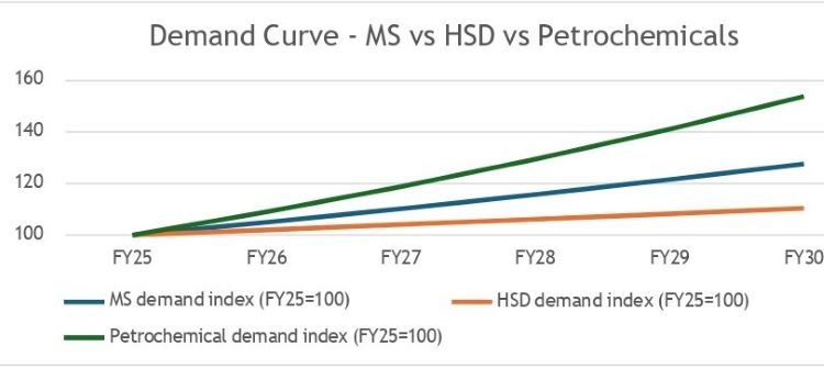 As may be seen from the figure below, MS & HSD demand growth moderates over the medium term due to electrification, biofuel blending, and efficiency gains, while petrochemical demand grows at a structurally higher pace, driven by packaging, infrastructure, and manufacturing demand.