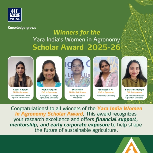 Sanjiv Kanwar, Managing Director of Yara South Asia, said: "We are immensely proud to recognize these five brilliant young women who embody the future of agricultural innovation in India. The Women in Agronomy Scholar Award is a testament to our commitment to nurturing academic excellence, fostering gender diversity, and bridging the gap between cutting-edge research and practical application in agriculture.