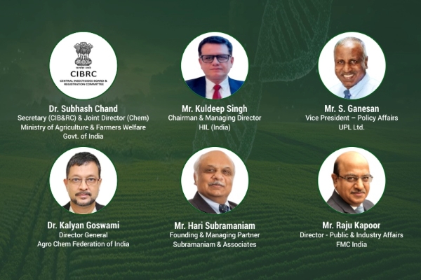 Speakers for the session are: Dr. Subhash Chand, Secretary, CIBR&C; Kuldeep Singh, CMD, HIL; S. Ganesan, Vice President – Policy Affairs, UPL; Dr. Kalyan Goswami, Director General, Agro Chem Federation of India (ACFI); Hari Subramaniam, Founding & Managing Partner, Subramaniam & Associates; and Raju Kapoor, Director - Public & Industry Affairs, FMC India